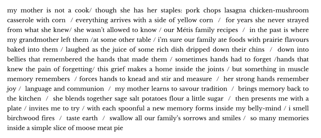 Elena Bentley is a multi-genre writer, editor, and proud Métis aunty from Saskatchewan. Her poetry chapbook, taliped, was published by 845 Press in 2023, and she’s the author of the children’s picture books The Pickle in Grandma’s Fridge (YNWP, 2022) and the forthcoming I Love My Aunty Because (GDI Press, 2026). She was longlisted for the 2024 CBC Poetry Prize, and her poems can be found in Arc Poetry, The Malahat Review, PRISM international, and Room, among others. Elena is the Editor for Grain magazine.